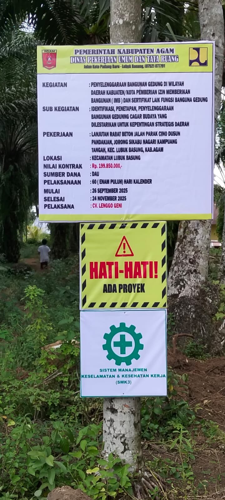 Pelaksanaan proyek rabat beton tersebut dikerjakan oleh CV. Lenggogeni dengan nilai kontrak sebesar Rp199.850.000. Berdasarkan hasil pantauan di lapangan, pekerjaan berjalan lancar, tertib, dan sesuai dengan standar teknis pelaksanaan.