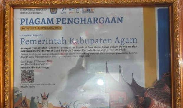 Sementara satu penghargaan lainnya diberikan oleh Direktorat Jenderal Perbendaharaan, yang menetapkan Kabupaten Agam sebagai pemerintah daerah tercepat di Provinsi Sumatera Barat dalam penyelesaian rekonsiliasi Pajak Pusat atas Belanja Daerah Semester II Tahun 2025.