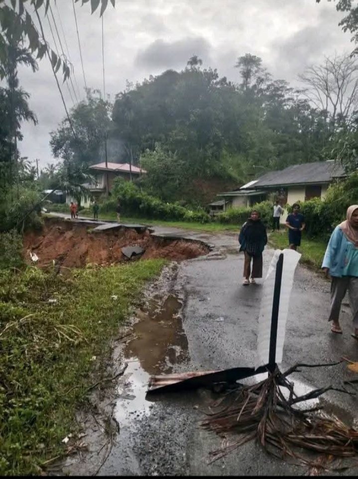 Jalan yang biasanya ramai dilalui oleh kendaraan warga kini berubah menjadi kanvas alam yang kacau, garis retakan tanah, dan siluet pepohonan tumbang yang seakan melukis potret ketidak berdayaan.