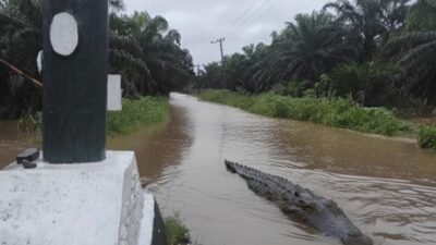 Agam, Wartapatroli.com – Seekor buaya muncul di badan jalan kawasan Nagari Tiku Limo Jorong, Muaro…