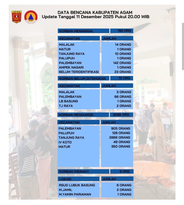 Kepala Dinas Kominfo Agam, Roza Syafridianti, menjelaskan bahwa data korban terdampak masih sangat dinamis seiring proses pencarian yang terus dilakukan di tiga kecamatan utama, yaitu Palembayan, Malalak dan Tanjung Raya.