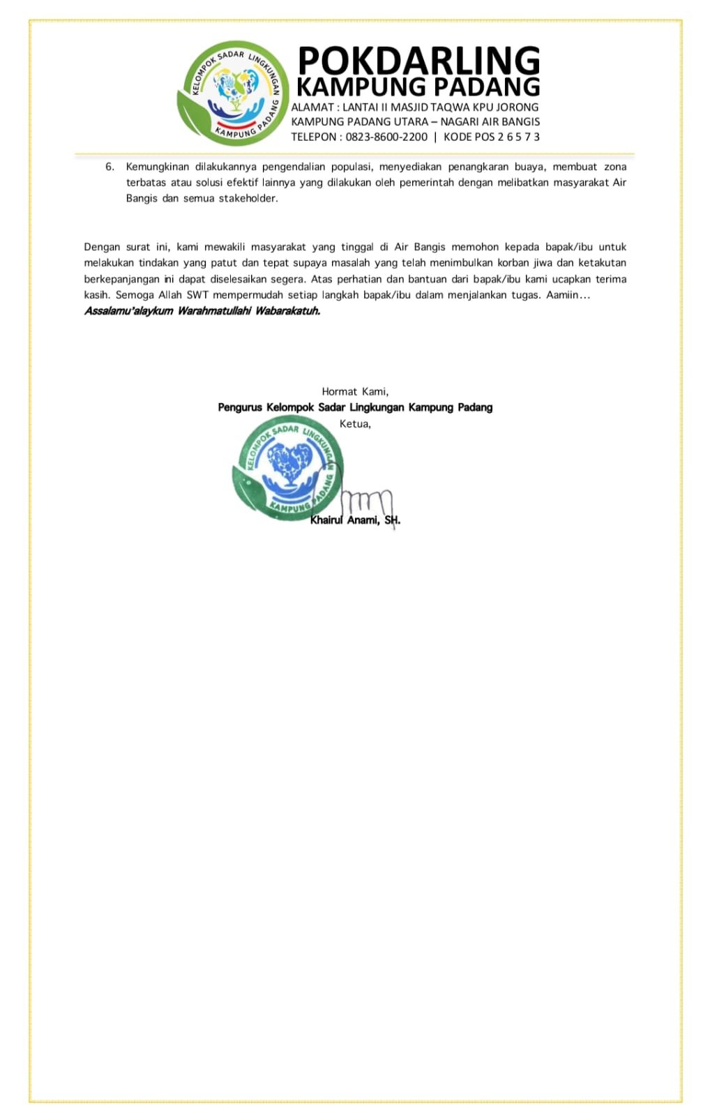 Melalui surat tersebut, Pokdarling Kampung Padang mendesak pemerintah dan instansi berwenang untuk segera melakukan asesmen dan penelitian terkait penyebab meningkatnya kemunculan buaya, menyiapkan solusi penyangga ekonomi masyarakat, serta melakukan intervensi serius agar tidak kembali terjadi korban jiwa.