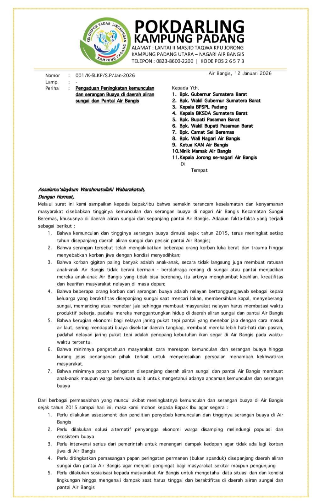 Pasaman Barat – Wartapatroli.com – Kelompok Sadar Lingkungan (Pokdarling) Kampung Padang, Nagari Air Bangis, Kecamatan Sungai Beremas, Kabupaten Pasaman Barat, secara resmi menyampaikan surat pengaduan kepada sejumlah pihak terkait atas meningkatnya kemunculan dan serangan buaya di daerah aliran sungai dan sepanjang Pantai Air Bangis.